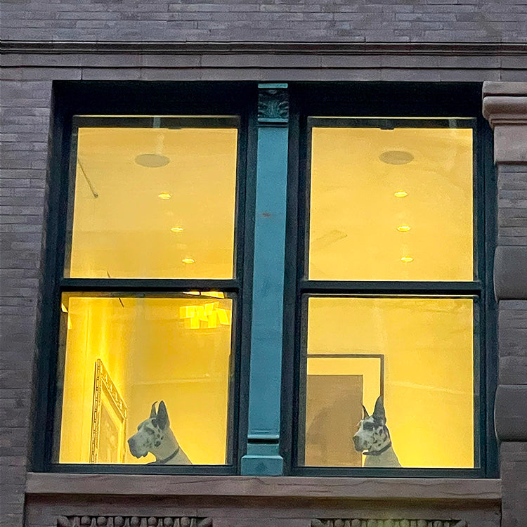 The two huge twin Danes, in a rare moment, gaze outside with canine curiosity from their high-ceiling loft on Elizabeth St.